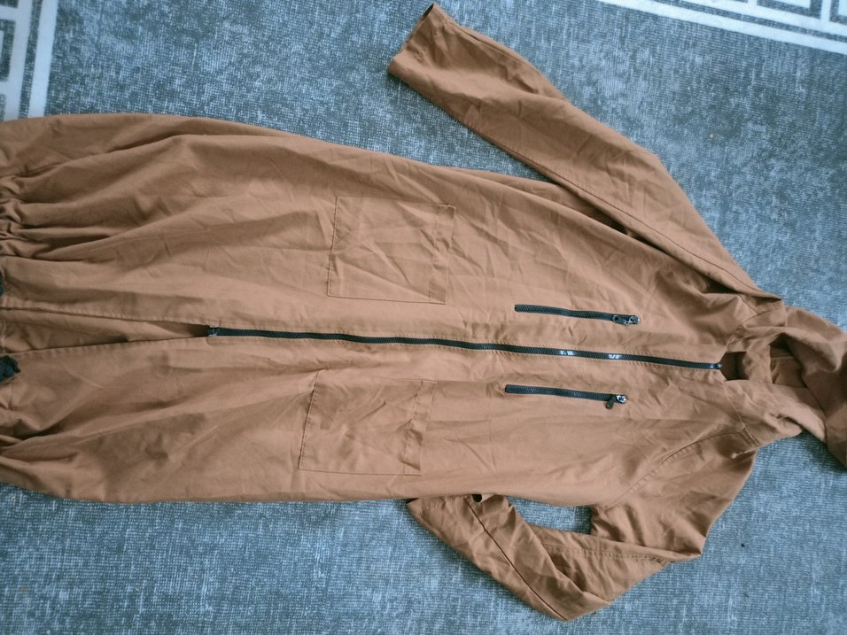 Bej renkte, uzun kesim, bol fitli hamile ceketi. Sentetik kumaştan, fermuarlı ve notched yaka detaylarına sahip, günlük kullanıma uygun sokak stili.