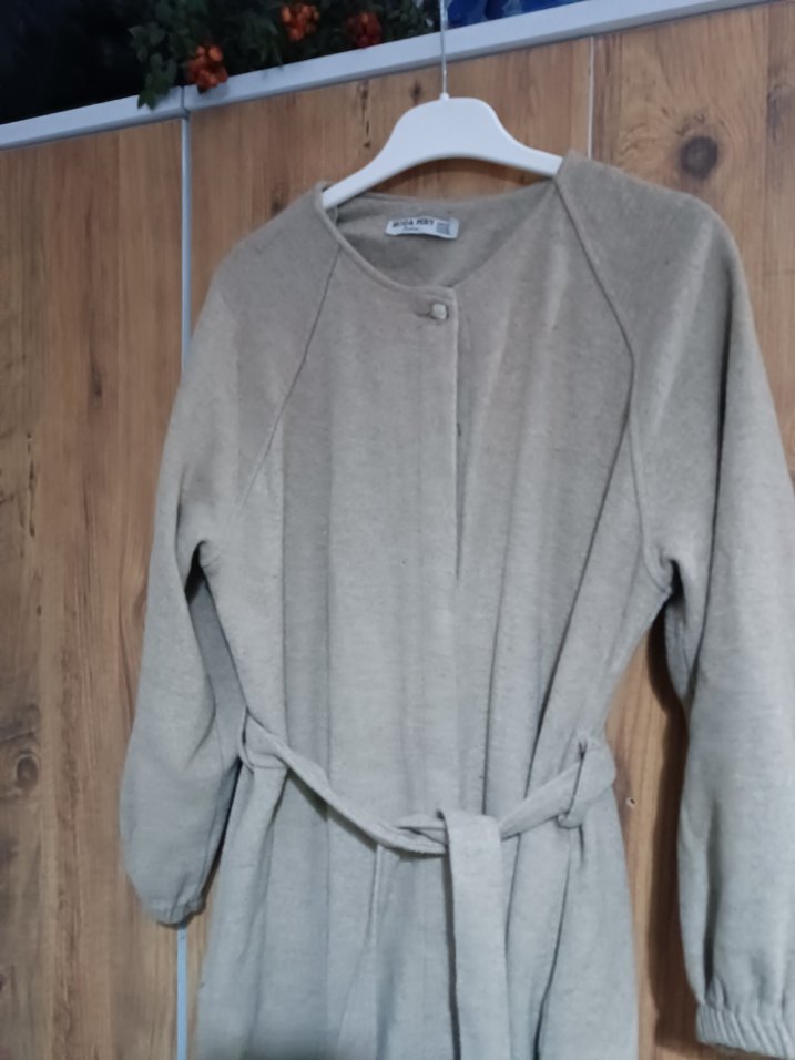 Bej renkli, uzun kesim hamile kabanı, düğmeli ve crew neck yakalıdır. Keten kumaştan üretilmiş, rahat ve sade tasarımdadır.