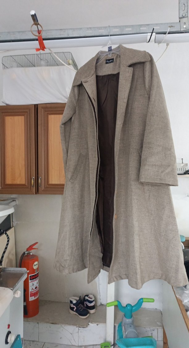 Bej renkli uzun hamile keten kaban, çıtçıtlı ve notched yaka detaylıdır. Yumuşak keten kumaştan, rahat kesim ve uzun kolludur. Günlük kullanım için uygundur.