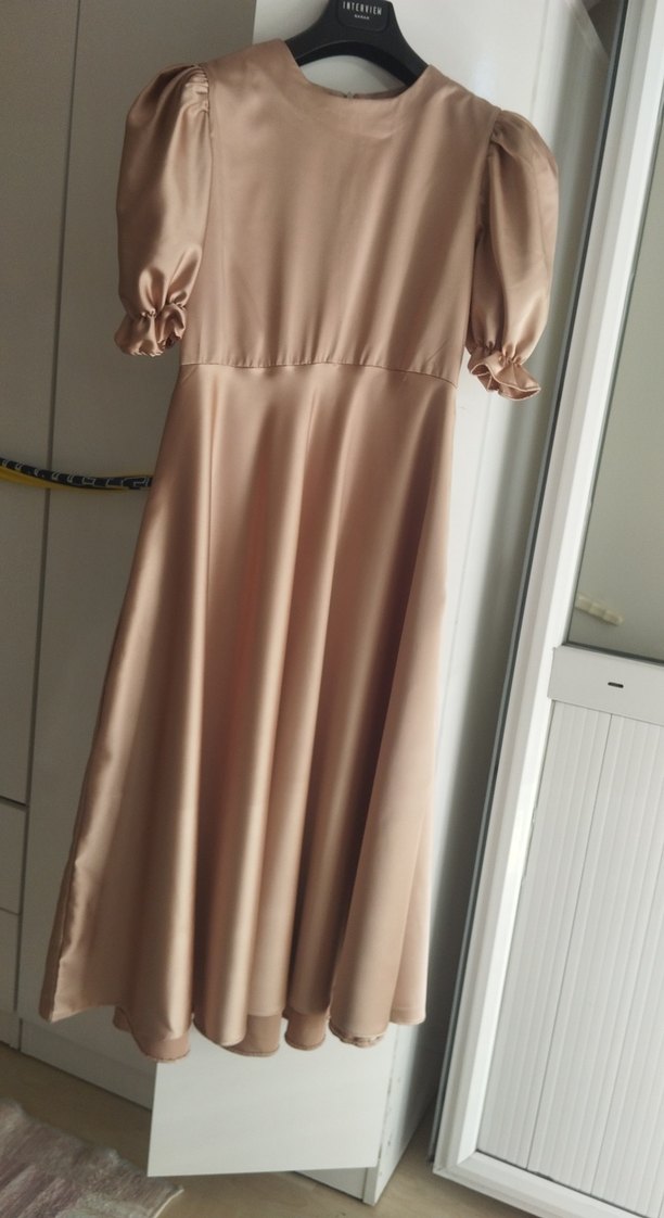 Bej renkli, ipek görünümlü uzun elbise, bol kesim ve V yaka ile. Drapeli detaylara ve ince askılı kollara sahip, modern klasik tarzda, düğünler için uygun. özel dikim üründür.omuzdan bel dikişi 35 cm etek boyu 83 cm on boyu 89 cm arka boyu