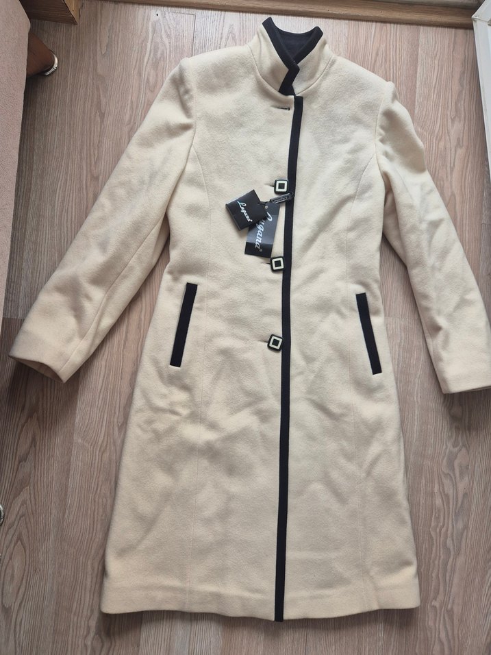 Bej renkte uzun kaban, siyah detaylı ön ve cep kenarları, dik yaka ve ön kapamada tokalar bulunur.