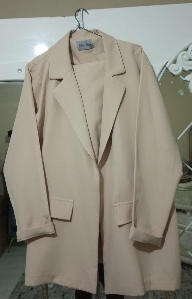 Bej renkli, uzun kesim kadın blazer ceket, kesik yakalı ve uzun kolludur. Düz ve yumuşak sentetik kumaştan yapılmıştır, ofis ve günlük kullanım için uygundur. pantolon, takım beraber veriliyor hiç kullanılmadı sıfır s/m beden (Rengi fotoğraftakinden biraz daha toz pembeye kaçıyor)