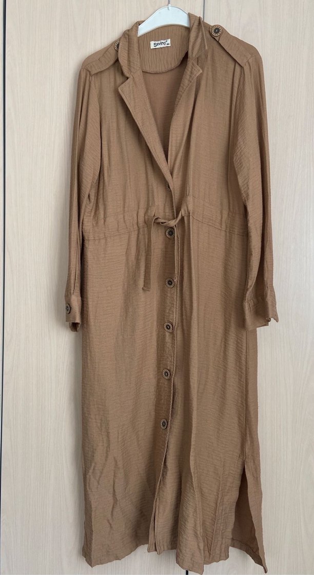 Bej uzun elbise, düğmeli ve notlu yaka detayına sahiptir. Bol kesimli, uzun kollu ve minimalist bohem tarzındadır.