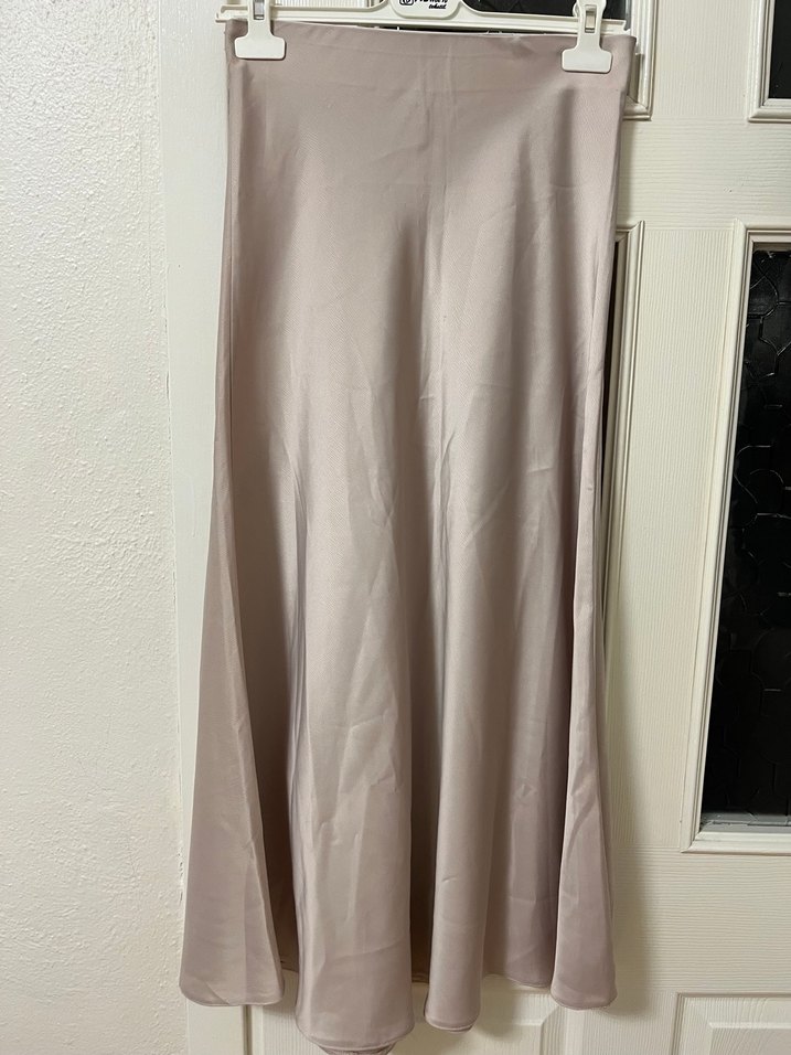 Kadınlar için uzun, dar kesim, drapeli ve satenimsi kumaştan yapılmış bej renkli etek.