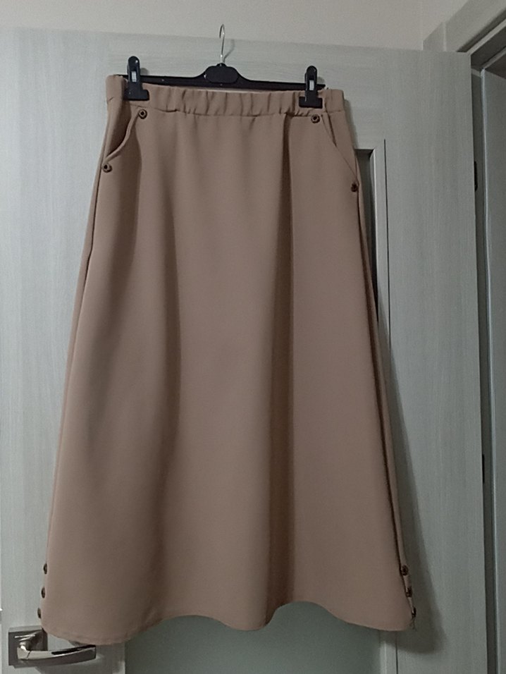 Günlük kullanıma uygun sade ve minimalist tasarım, rahat düğme detaylarıyla şık görünüm. Beden etiketi mevcut değil . Sorunsuzdur .ölçüleri : 90 cm uzunluk . 43 cm bel(lastiklidir) . 54 cm basen .