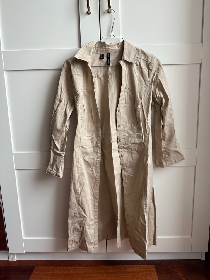 Bej renkte uzun yumuşak kumaştan, düğmeli ve kesik yakalı kadın gömlek elbise. Ofis ve günlük sokak stili için uygundur.