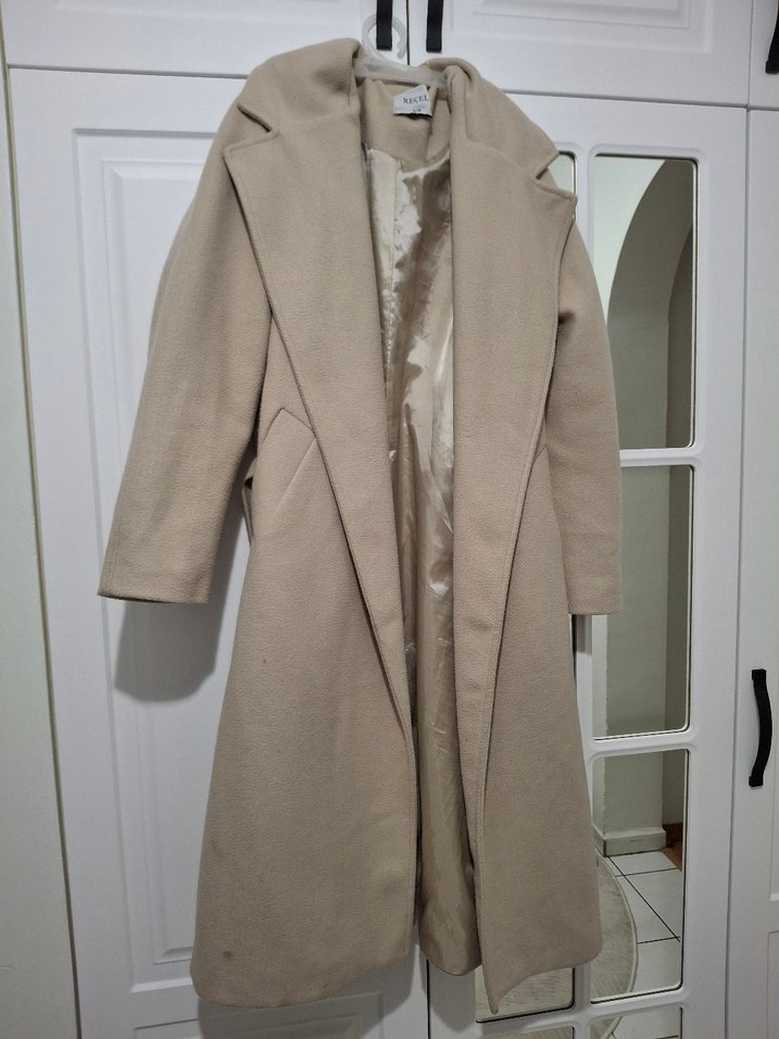 Bej uzun kadın kaban, yakalı ve drapeli tasarıma sahiptir. Uzun kollu, rahat kesim ve yumuşak, sıcak kumaştan yapılmıştır. Ofis için klasik ve şık bir tercih. paça kısmında biraz lekeler var. dokuzu bozulmaması için yıkamadım .
