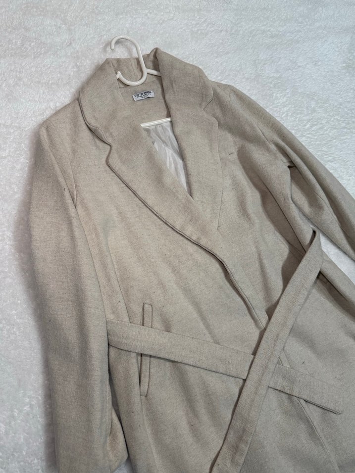 Bej uzun kaban, kesik yaka ve düğmeli detaylıdır. Rahat kalıbı ve uzun kollarıyla gündelik kullanıma uygundur.