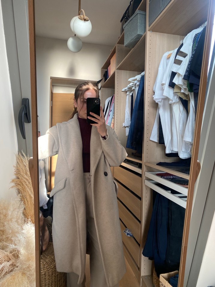 Yumuşak dokulu, uzun taş rengi kadın kaban, iki ön cepli içi astarlı.
