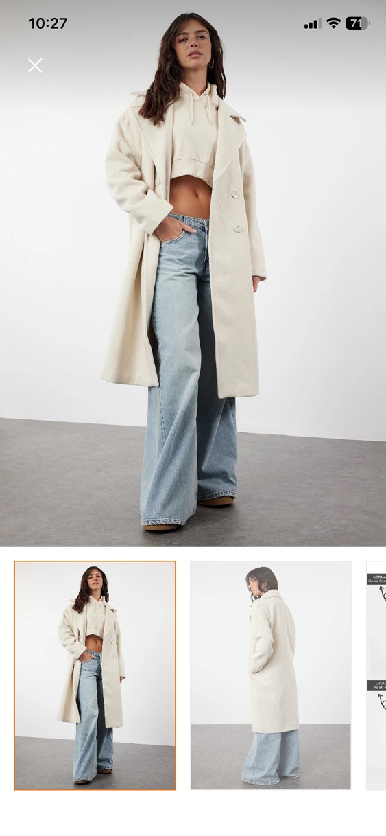 Açık bej renkli uzun kaban, rahat kesimi ve zahmetsiz şıklığı ile gündelik kullanıma uygundur. 36 beden çok az kullanıldı