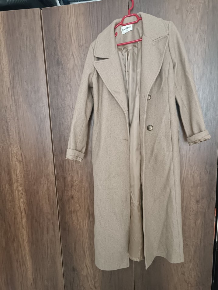 Bej renkli, uzun kadın kabanı, düğmeli ve keskin yaka detaylıdır. Yumuşak keten kumaştan üretilmiş, uzun kollu ve rahat kesimdir. Günlük ve şık sokak stiline uygundur.