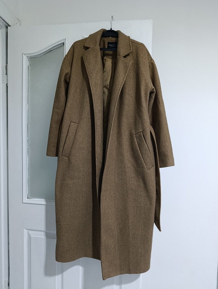 Bej renkte, uzun yün kadın kaban. Kemerli ve kesik yaka detaylarıyla günlük sokak stiline uygun, rahat kesim.