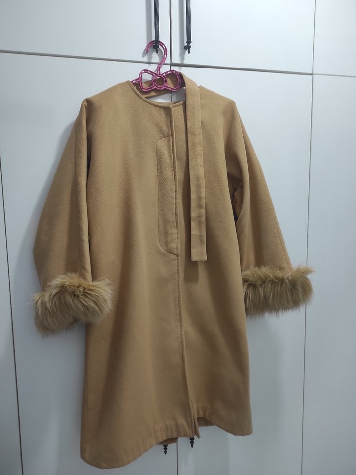Kürklü kol detayları ve bol kesimiyle bej uzun kadın kabanı, yumuşak ve sıcak kumaştan üretilmiştir. Günlük kullanıma uygundur.