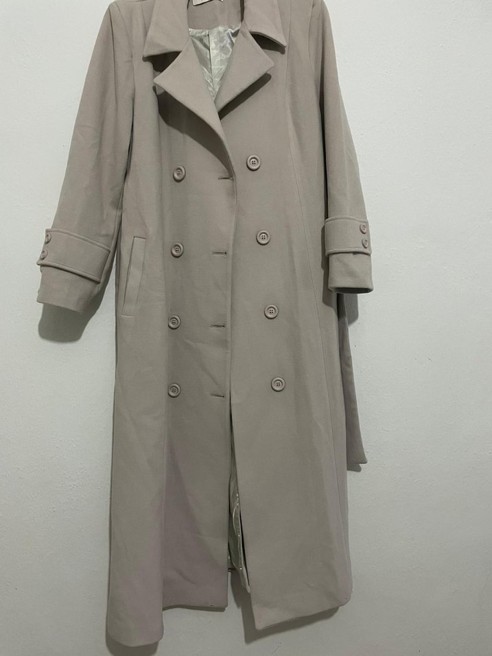 Bej renkli uzun kase kaban , kesilmiş yaka ve çift düğmeli kapama ile tasarlanmıştır. Uzun kollu ve normal kesimdir, klasik ve günlük kullanıma uygundur.