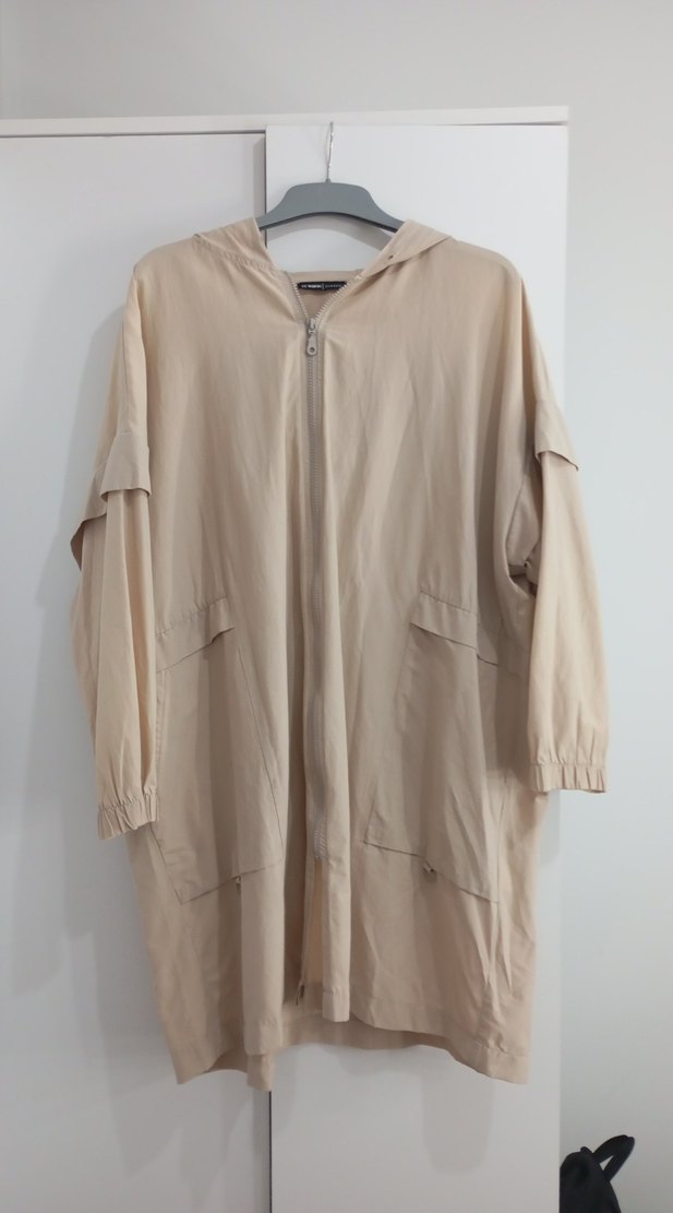 Bej renkli uzun keten kadın ceket, salaş kesim ve bisiklet yaka, kollarındaki lastiklerde eskime vardır ama düzeltilebilir kusur onun haricinde bi kusuru yoktur ölçüleri Göğüs 74 Kol 25 Boy 93