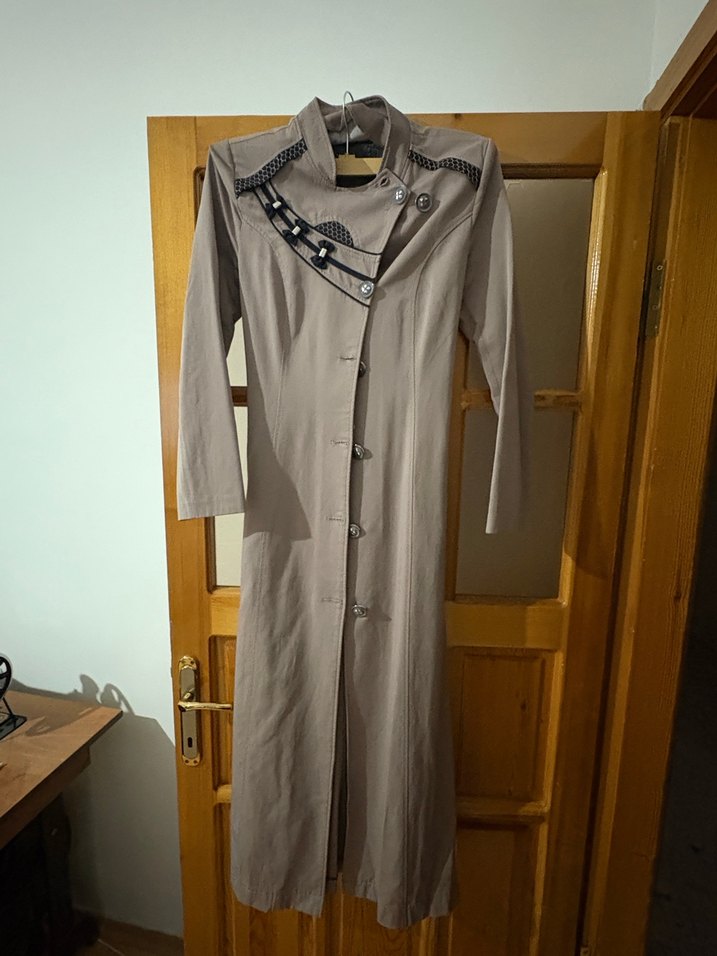 Bej renk uzun keten kumaştan yapılmış, düğmeli ve kesik yaka detaylı kadın kabanı. Regular fit ve uzun kollu, günlük ve sokak modasına uygun. Avant-garde siyah bant detayları bulunur. Boy 132 en 42
