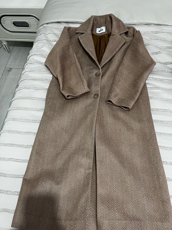 Bej renkte, keten kumaştan uzun kadın kaban. Düğmeli, uzun kollu ve regular fit kesim.