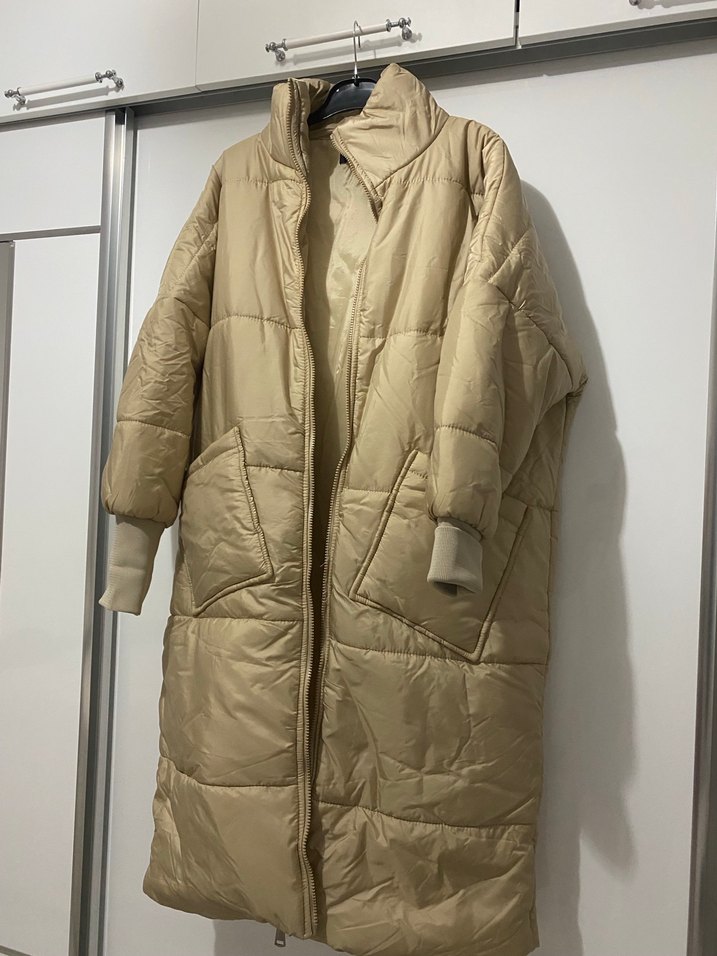 Bej renkli, uzun ve bol kesim kadın kışlık ceket. Fermuarlı, uzun kollu ve keten dokulu yumuşak kumaştan üretilmiştir. Rahat sokak stili ve günlük kullanım için uygundur. Hiç kullanılmadı etiketi yok.Boy uzunlugu 106