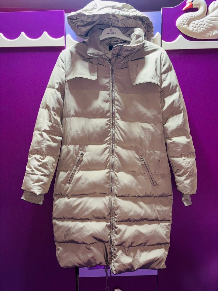 Bej renkli, uzun kesim kadın kışlık mont, kürklü ve kapüşonlu detaylara sahiptir. Yumuşak sentetik kumaştan üretilmiş, dar kesim ve notched yaka tasarımlıdır. Günlük kullanıma uygundur. ❄️