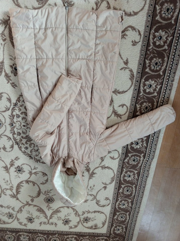 Bej renkli, uzun kollu ve uzun boylu kadın kışlık mont. Yüksek yakalı ve fermuarlı, yumuşak sentetik kumaştan. Sokak modasına uygun ve günlük kullanıma uygun. ❄️