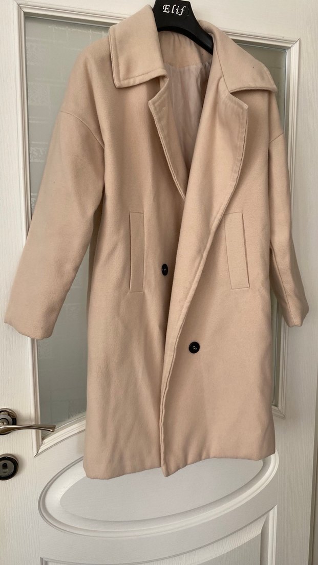 Bej uzun kaban, düğmeli ve kesimli yaka detaylı. Yumuşak ve sıcak kumaştan, rahat kesim ve uzun kollu. Günlük kullanım için uygundur.