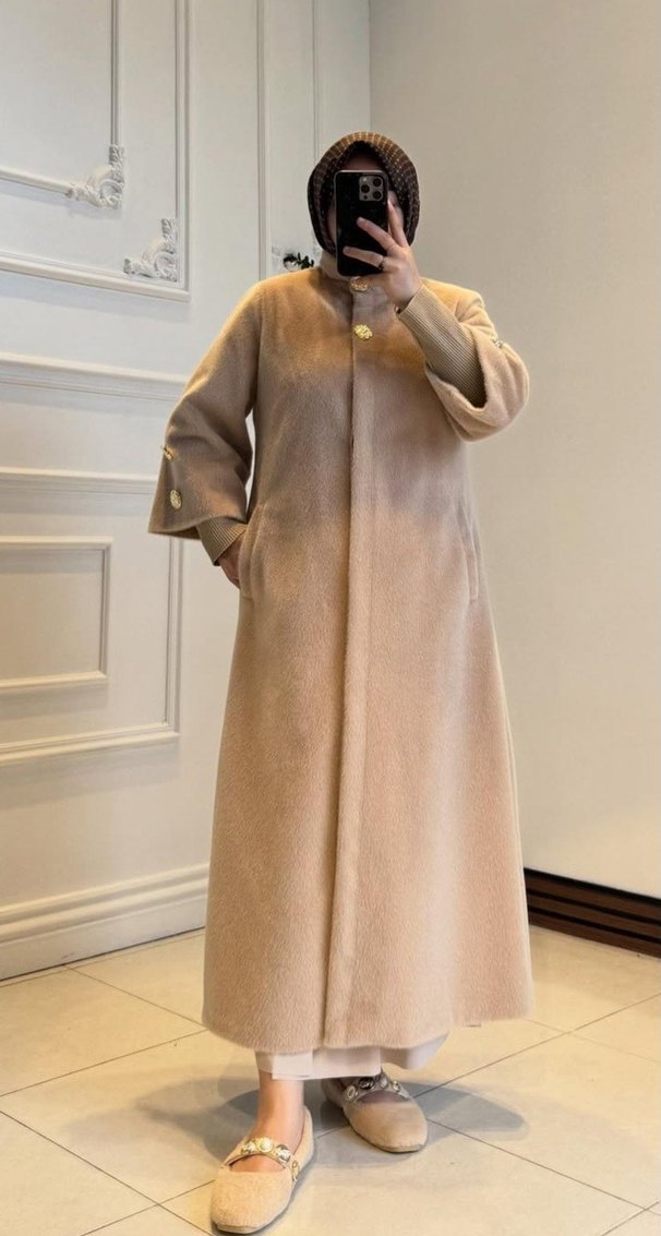 Bej renkli, uzun ve bol kesim kadın kabanı, yumuşak ve sıcak kumaştan üretilmiştir. Kürk detaylı, uzun kollu ve klasik yakalıdır, günlük kullanıma uygundur.