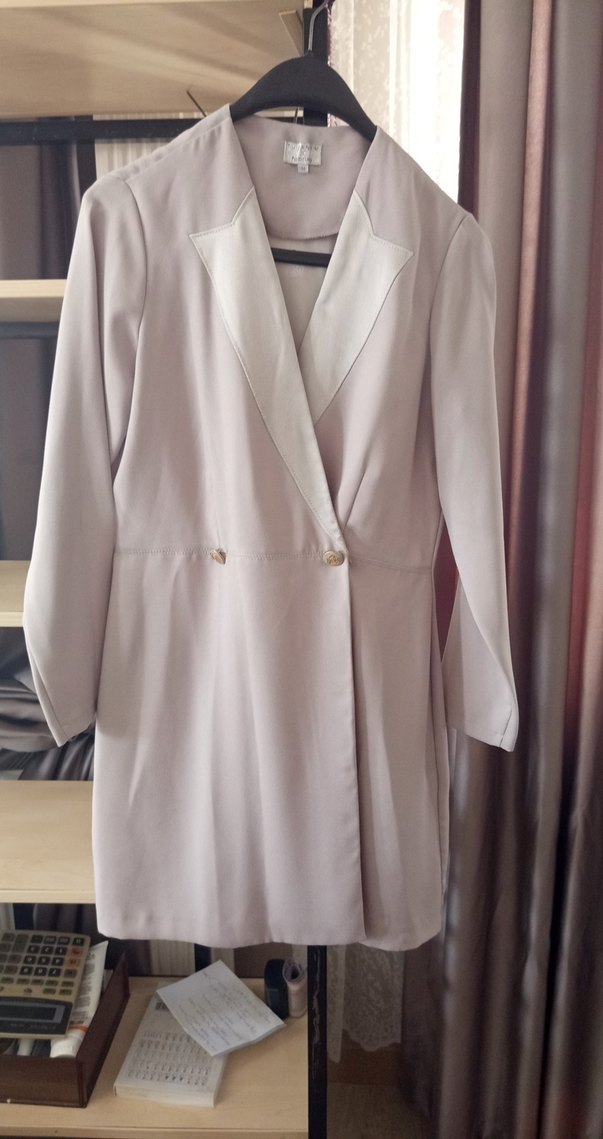 Bejimsi gri renkli, uzun kesim ceket elbise düğmeli ve kesimli yaka detaylıdır. Ofis kullanımı için uygun, regular fit ve uzun kolludur. Kumaşı ipeksi ve desensizdir.