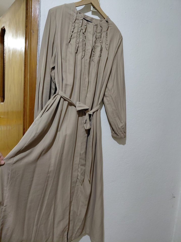 Bej renkli, uzun bol kesim ve drapeli detaylara sahiptir. 48 beden hediye geldi bir kere giydim ama bedeni çok büyük geldi sıfırdan farksız ürünün kendisini alınca da yeni olduğunu anlarsınız herhangi bir defosu yok.üzerinde yok gibidir. Fiyatta yardımcı olurum.