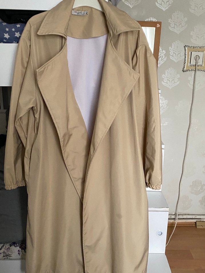 Bej renkte, uzun kesim, dökümlü ve rahat kesimli kadın trençkotu. Notlu yaka ve uzun kolludur, hafif sentetik kumaştan üretilmiştir. Astarlıdır.