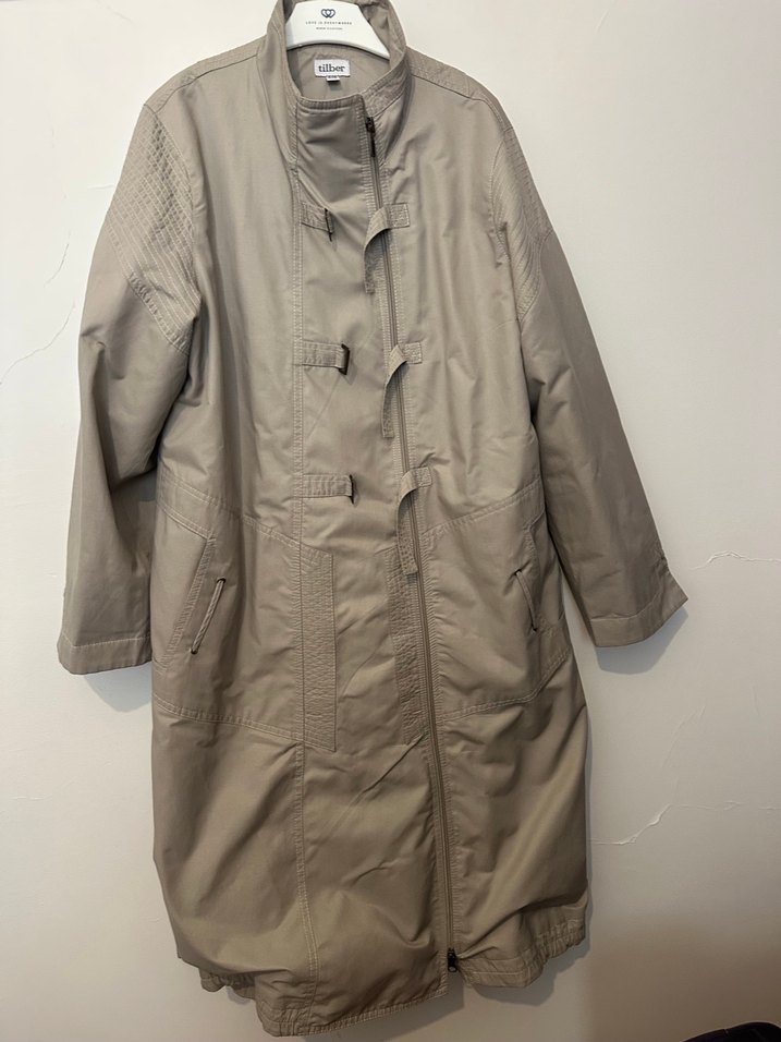 Bej renkli, uzun kesim, düğmeli ön kısmı ve kesik yaka detaylı kadın trençkot. Keten kumaştan, salaş kesim ve desen içermeyen minimalist sokak stili. Günlük kullanıma uygun uzun kollu model.