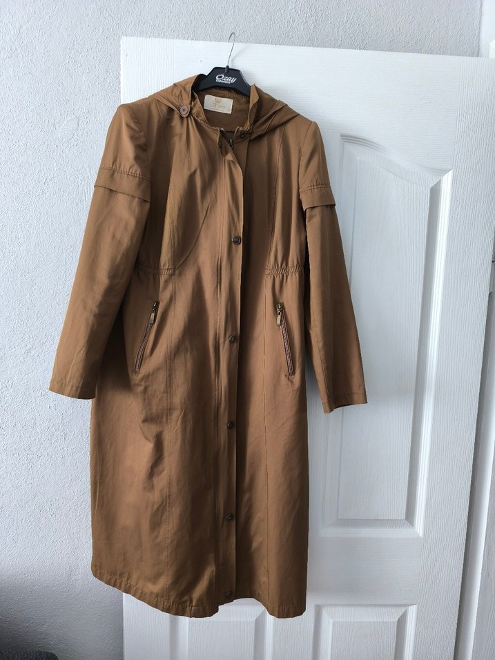 Bej renkli uzun trençkot, düğmeli ve kesik yakalıdır. Keten kumaştan yapılmış, regular fit ve uzun kolludur. Minimalist sokak stili için uygundur. ✨