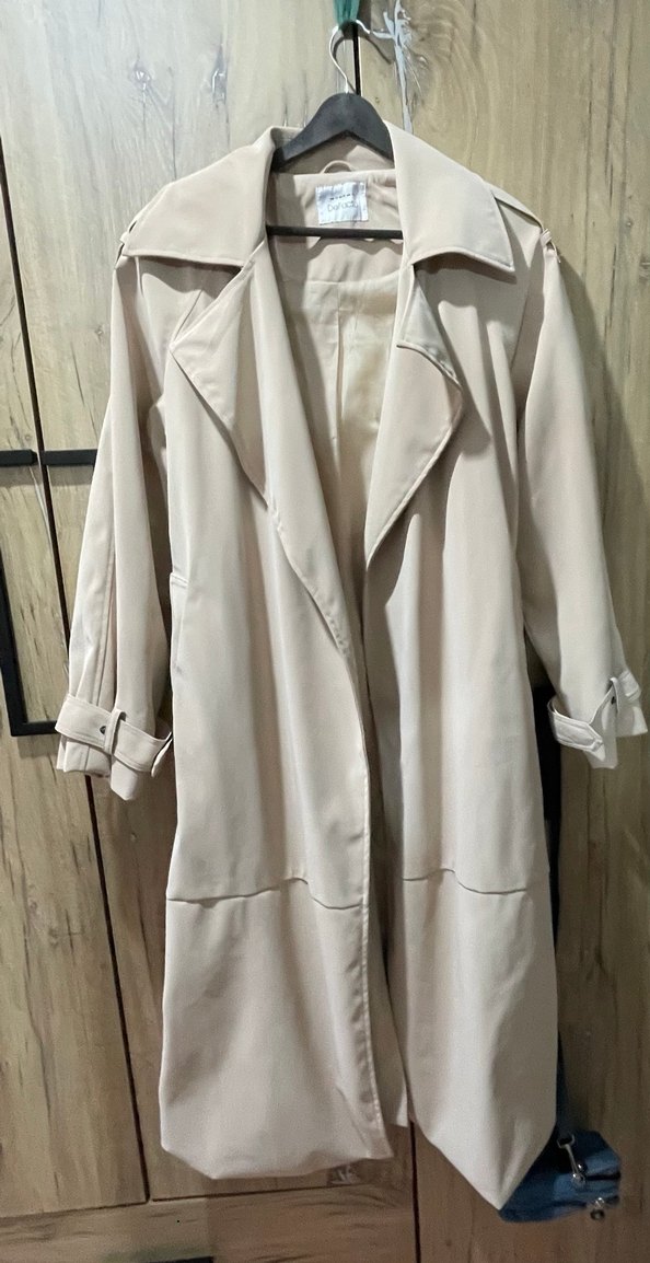 Bej renkli, uzun boy kadın trençkot. Sentetik kumaştan üretilmiş, notched yaka ve uzun kolludur. Rahat kesim ve drapeli tasarıma sahiptir. Beden XS fakat M-L bedenler için daha uygundur.