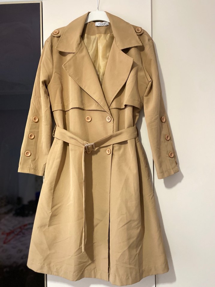 Bej renkli, uzun kesim kadın trençkot, yakada kırmalı ve düğmeli detaylara sahiptir. Kemerli, askılı kollu ve rahat kesimdir. Günlük kullanım için uygundur. Sadece 1 kere kullanıldı ihtiyaç fazlası olduğundan satıyorum