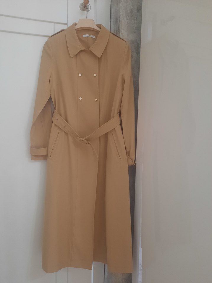Bej renkli, düğmeli ve yakalı uzun kol trençkot. Sentetik kumaştan üretilmiş, klasik ve rahat kesime sahip, ofis için uygun.