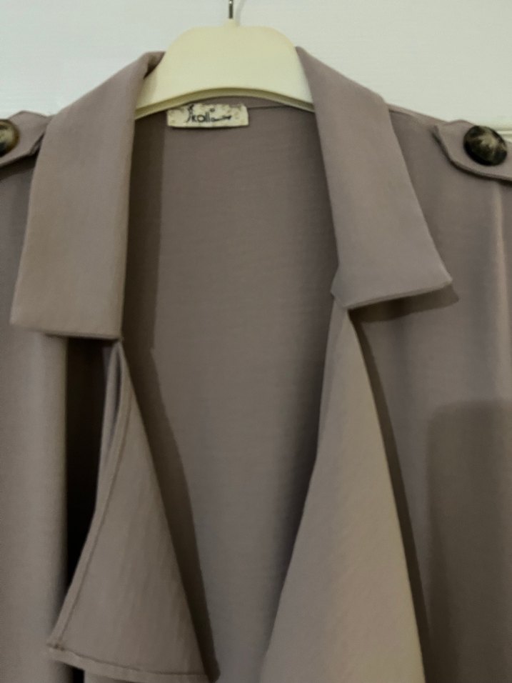 Düğmeli, bej uzun kadın trençkot, yakası kırmalı ve sentetik yumuşak kumaştan. Salaş kesim ve uzun kollu, günlük sokak tarzı için uygundur.