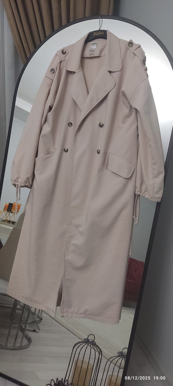 Bej uzun kadın trençkot, düğmeli ve salaş kesimlidir. Notlu yakalı ve uzun kollu, sentetik kumaştan üretilmiştir, günlük sokak stili için uygundur.