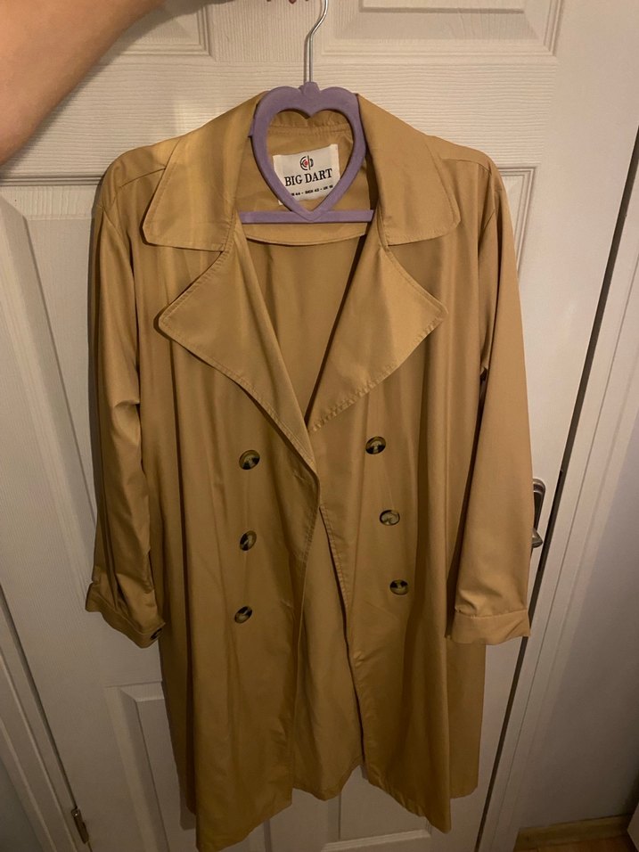 Bej renkli, uzun kesim, düğmeli kadın trençkotu. Notched lapel yaka ve bol kesim uzun kollu, parlak ipeksi kumaştan, günlük kullanıma uygun.