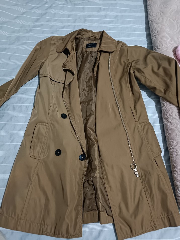 Bej uzun trençkot, düğmeli ve kesik yaka detaylıdır. Gevşek kesim, uzun kollu ve sentetik kumaştan üretilmiştir, günlük kullanıma uygundur. iç astar cep kısmında ufak bı delik vardır içeride kalıyor görünmüyor