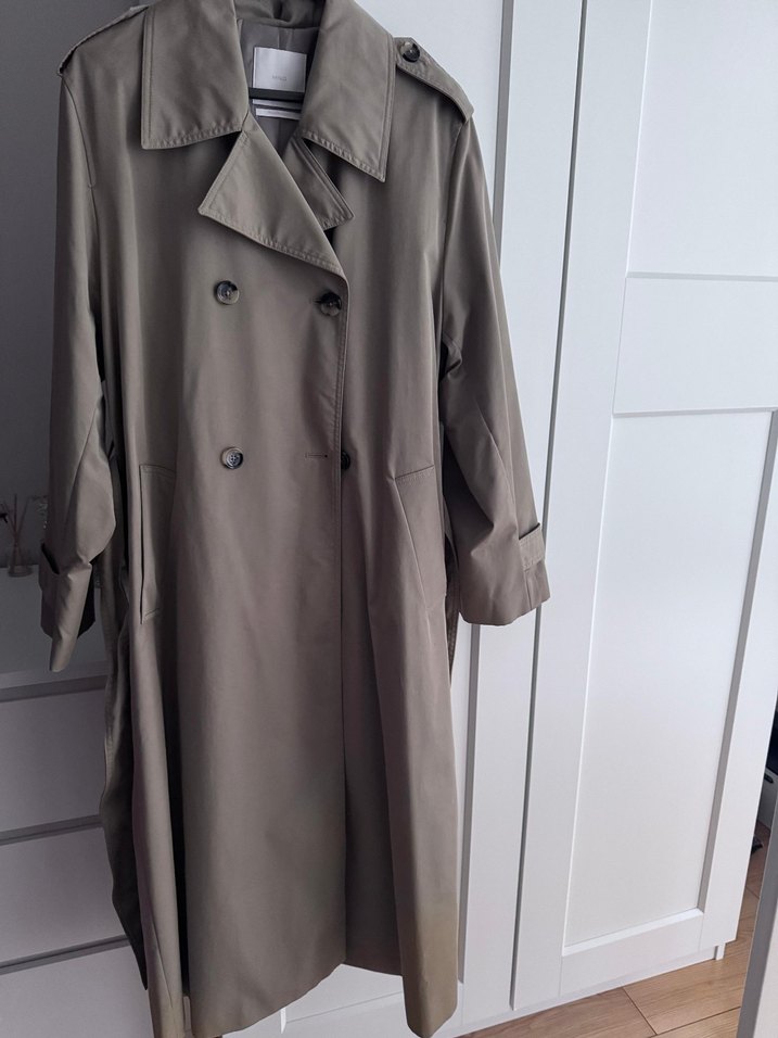 Bej renkli, uzun kesim kadın trençkot, düğmeli ve kesik yaka detaylıdır. Sentetik kumaştan üretilmiş, bol kesim ve uzun kolludur. Minimalist tarz için uygundur.