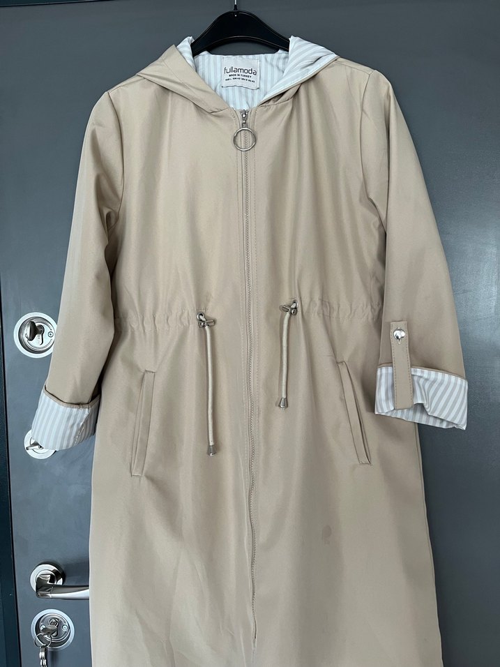 Bej renkli, uzun ve bol kesim kadın trençkot, fermuarlı ve sentetik kumaştan üretilmiştir. Çentikli yakası ve çizgili manşetleriyle günlük kullanıma uygundur.