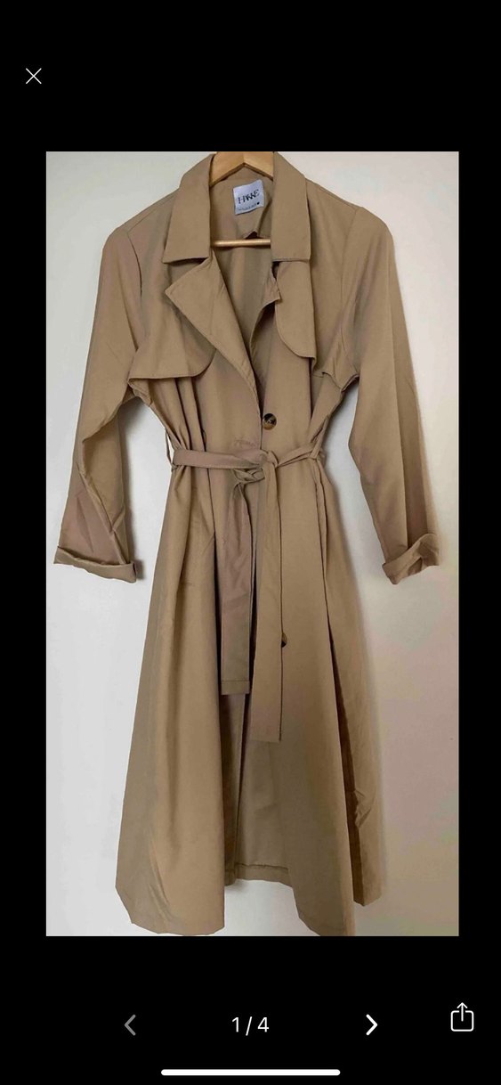 Kemerli ve kesik yakalı bej uzun kadın trençkot. Düz sentetik kumaştan, rahat kesim ve askılı kollu, günlük kullanıma uygun şık bir parça.