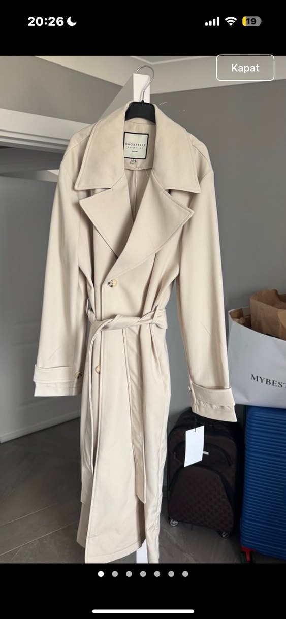 Bej renkte, uzun kesim ve kemerli kadın trençkot. Notch yaka ve uzun kollu, düz desensiz yapısıyla günlük rahat sokak stiline uygun. 'MYBES' etiketi bulunur. Amerikadan getirilmiştir.