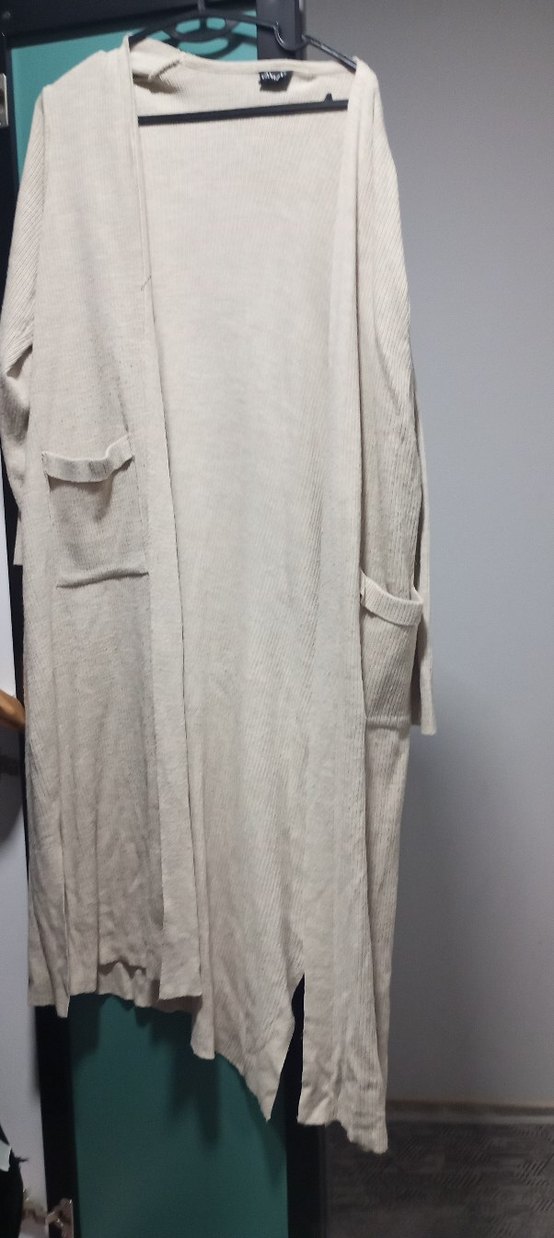 Bej renkli uzun keten hırka, yakalı ve uzun kollu, bol kesim ve cep detaylıdır. Rahat ve şık bir günlük tercih.