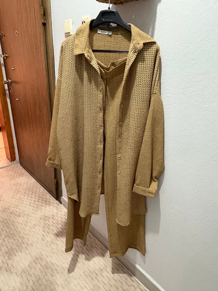 Bej renkli, keten kumaştan uzun kadın tunik pantolon.Düğmeli, bol kesim ve kesik yaka detaylıdır. Uzun kollu ve desensiz, günlük kullanıma uygundur. Sadece 1 kere giyildi .