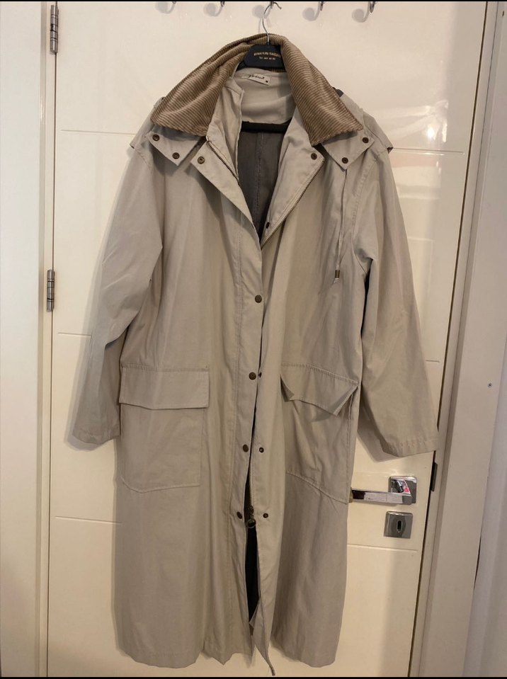 Bej renkli uzun kadın yağmurluğu, düğmeli ve notalı yakalıdır. Bol kesim, uzun kollu, iki ön cepli ve yumuşak sıcak kumaştan yapılmıştır.M beden ancak 42-44 bedene uygundur.