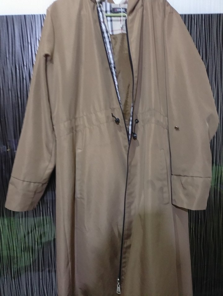 Fermuarlı ön kısmı ve kesimli yaka detayı olan bej uzun kadın yağmurluğudur. Bol kesim, uzun kollu ve sentetik kumaştan yapılmıştır, günlük sokak stiline uygundur. ️
