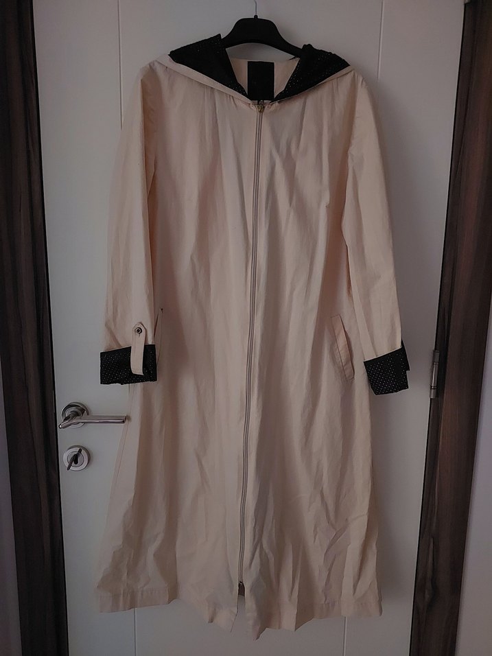 Bej uzun kadın yağmurluk, bol kesim ve drapeli tasarıma sahip, notch yaka ve uzun kolludur. Önden fermuarlı, sokak tarzıyla günlük kullanıma uygundur. ️Yıkamaya fırsatım olmadı birkaç lekesi var.Boy 115 en 55