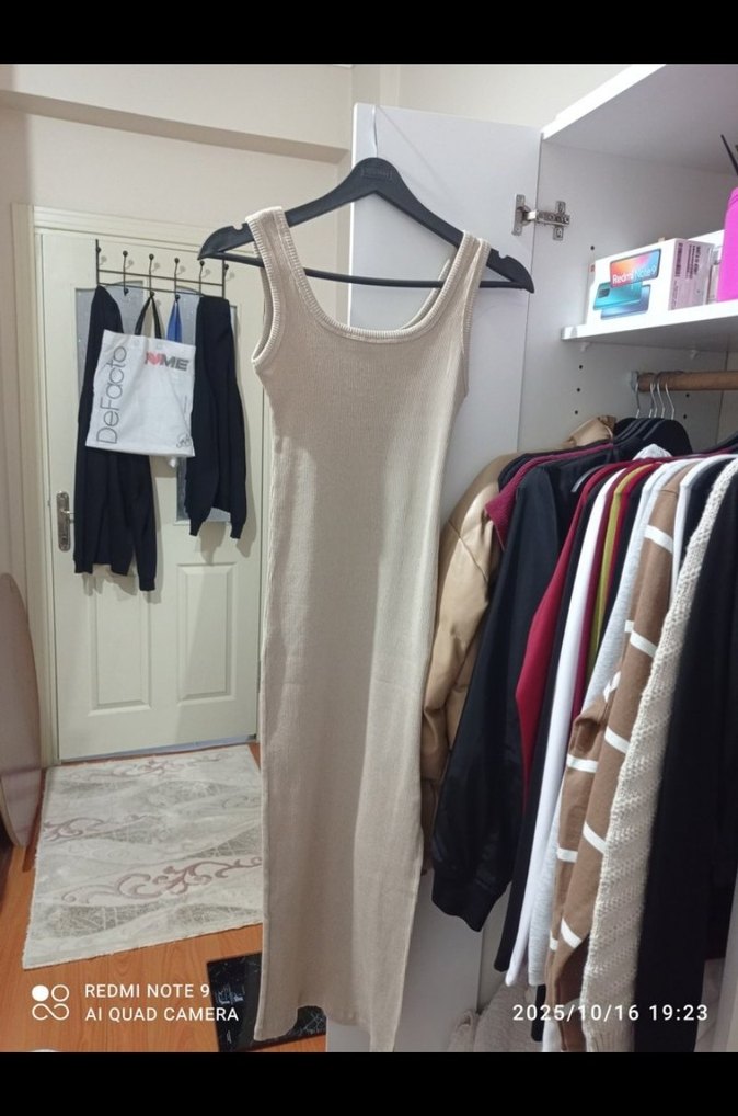 Yumuşak pamuklu kumaştan bej, uzun ve kolsuz bu elbise, günlük kullanım için hafif ve şık bir görünüm sunar. s,m giyer 120 cm uzunluğunda trndyl bianco lucci den aldim