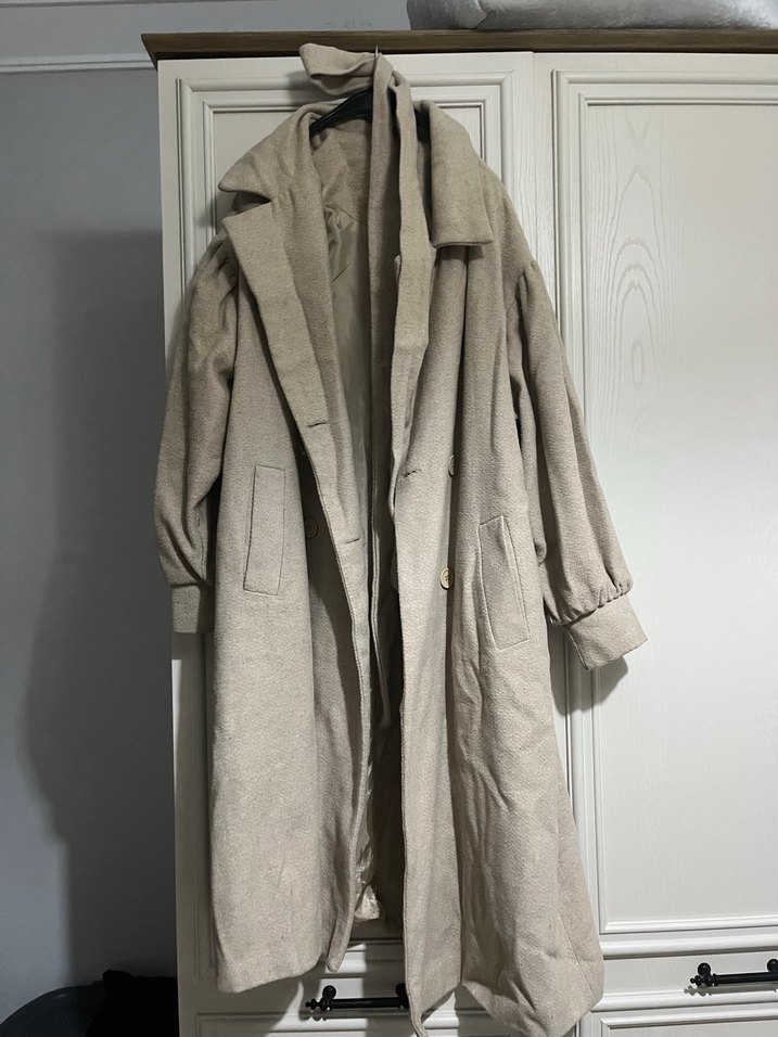 Uzun, bej kaşe kumaştan üretilmiş, düğmeli ve geniş kesimli bir kadın kabanı. Notlu yakası ve uzun kolları vardır. Rahat sokak stili için uygundur.