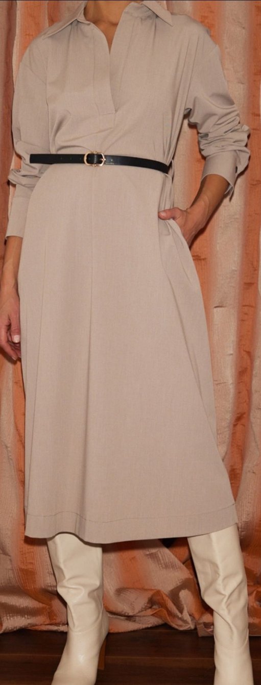 Bej renkli, kemerli, bol kesim uzun elbise. ofis şıklığı sağlar. sentetik kumaştan üretilmiştir. kemerli